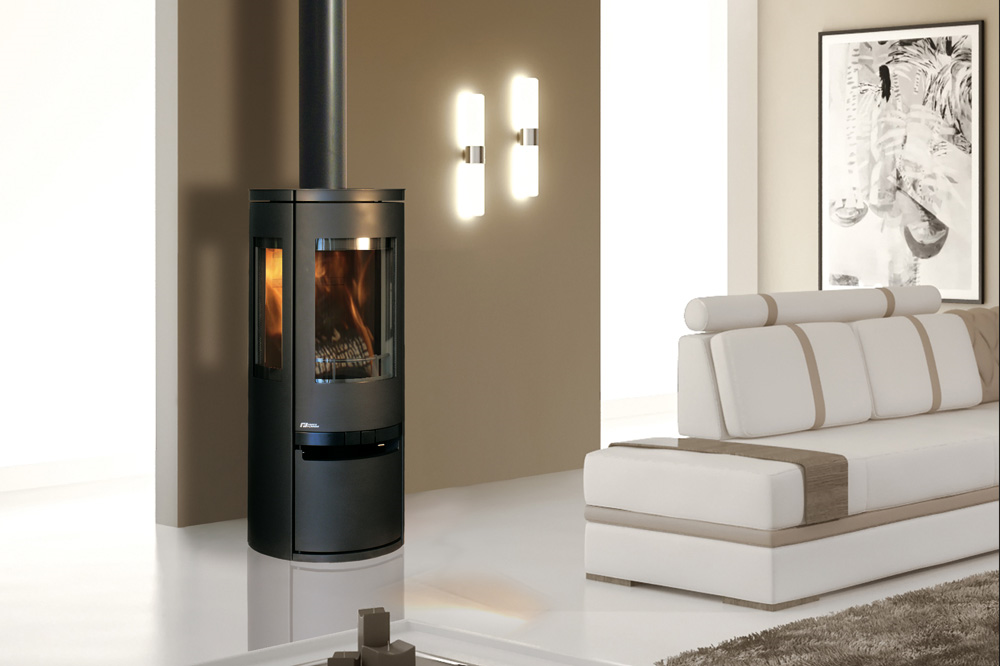 Poêle à bois Soro trois faces vitrées, rond sobre et contemporain